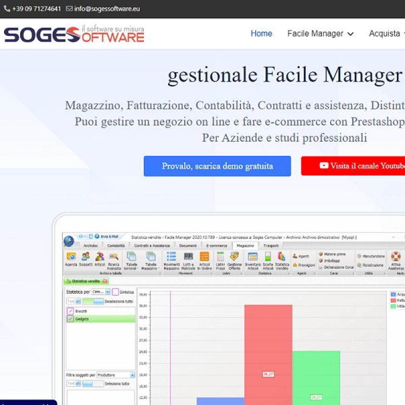 Soges Software produce, commercializza e assiste il gestionale Facile Manager, software di contabilità, magazzino, fatturazione e di creazione e gestione di un negozio on line, grazie all'integrazione con il noto software open source Prestashop.